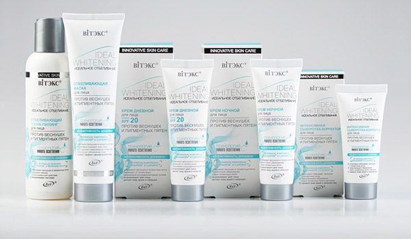 The "IDEAL WHITENING Perfect Whitening" line from Vitex is designed to give your skin a shining white. The newest technology of "clever" clarification of a skin actively works: there is a definition of the pigmented sites which need clarification, and target influence on them.